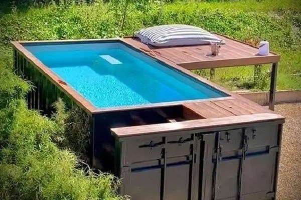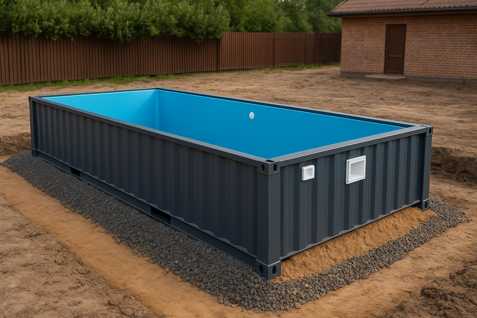 Бассейн из морского контейнера — это полностью готовая металлическая конструкция, переработанная под водоём. Она покрыта антикоррозийным составом, утеплена и изнутри отделана трёхслойным ПВХ-лайнером толщиной 2 мм. В отличие от бетонных и каркасных бассейнов, контейнерный вариант устанавливается за один день, не требует стройки и служит до 30 лет.